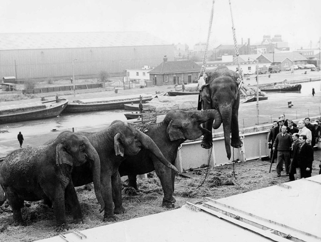 This image shows four elephants in South West India Docks, returning from a Chipperfield’s Circus tour of South Africa in 1968. From left to right are Sally, Leila, Mary and Camella in the sling.
