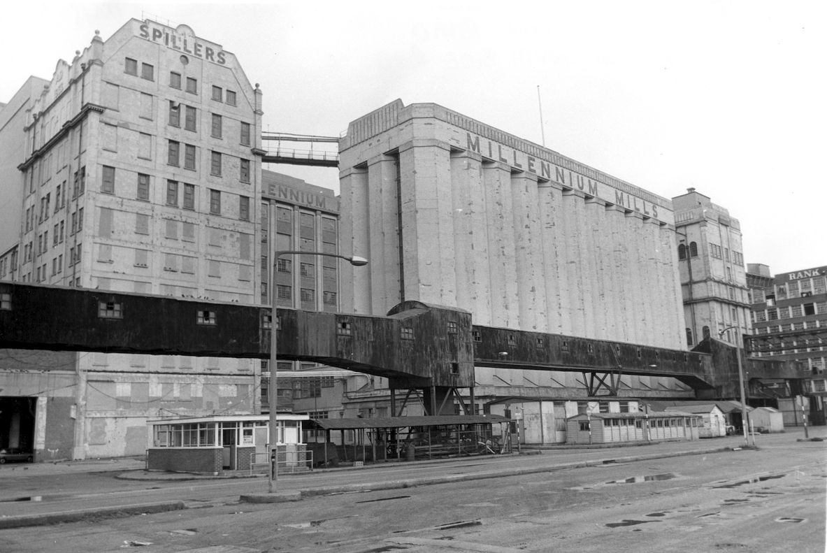 2. South facade, Spillers Millennium Mills, from Mill Road. 30 March 1984. Courtesy of Newham Archives and Local Studies Library